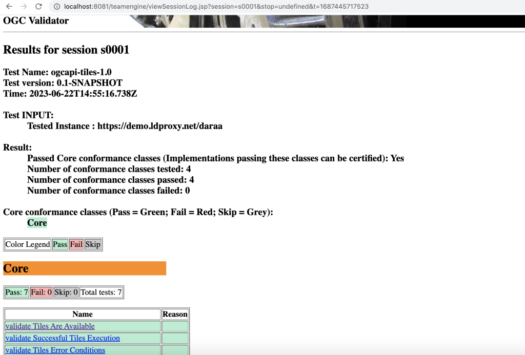 Figure 2 is a screenshot of TEAM Engine, the open source software used by the OGC Validator, presenting test results for a specific implementation of OGC API – Tiles.