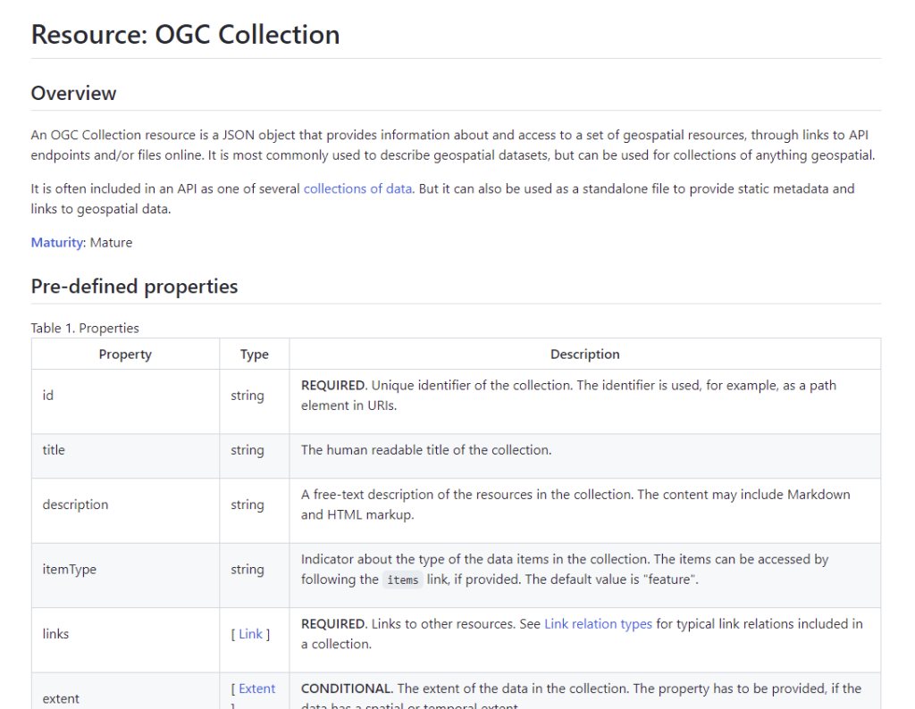 But while STAC pioneered clear static options for both individual items of imagery and other spatiotemporal assets, as well as collections of that type of data, there had been missing an equivalent ‘static collection’ for vector data. The OGC API – Feature Collection (that STAC extends for its Collection) as specified is only part of an API response, not an independent JSON resource that can be used independently. But it was a well-designed modular part, and Clemens Portele and Peter Vretanos, the editors of the Features specification, were always supportive of pulling it out.