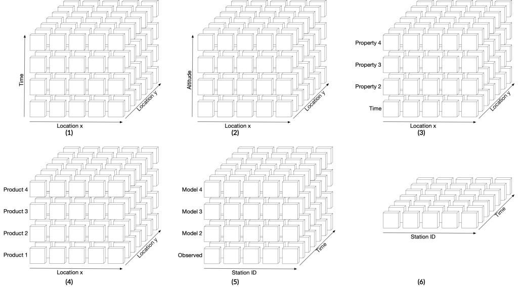 Still, the issue could not be fully solved at the workshop, which is why the definition provided herein speaks of the “ideal data cube” being spatially dense. The following figure shows different implementations of data cubes. Each cell may contain 1 to many variables. Time can be among these variables.